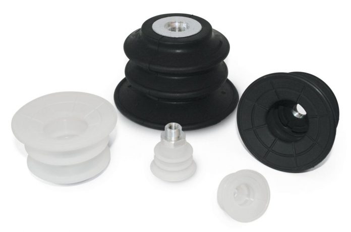 These bellows cups crumple up when in contact with surface to be gripped and in presence of a vacuum, thus creating a quick lifting movement independently from the automation. This rapid movement prevents the load beneath from remaining stuck to the lifted one. Thanks to their great flexibility, they can also be used to compensate flatness errors or for gripping on inclined surfaces.