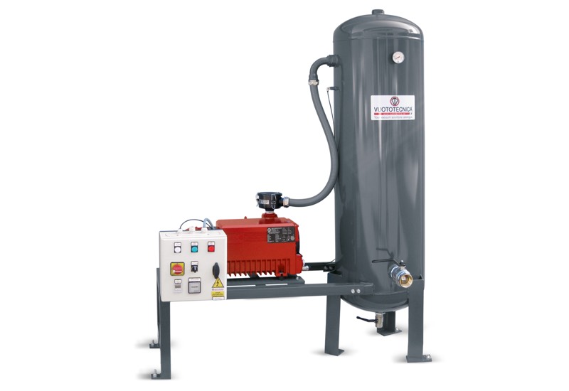 The level of vacuum, preset via the mini vacuum switch is automatically maintained in the tank. The pump operation can be both continuous or automatic. These pump sets are normally used for interconnecting several vacuum-operated machines and, for safety reasons, for vacuum handlers since, in case of electricity failure, they allow the vacuum cups to maintain the grip for an amount of time proportional to the tank capacity.
