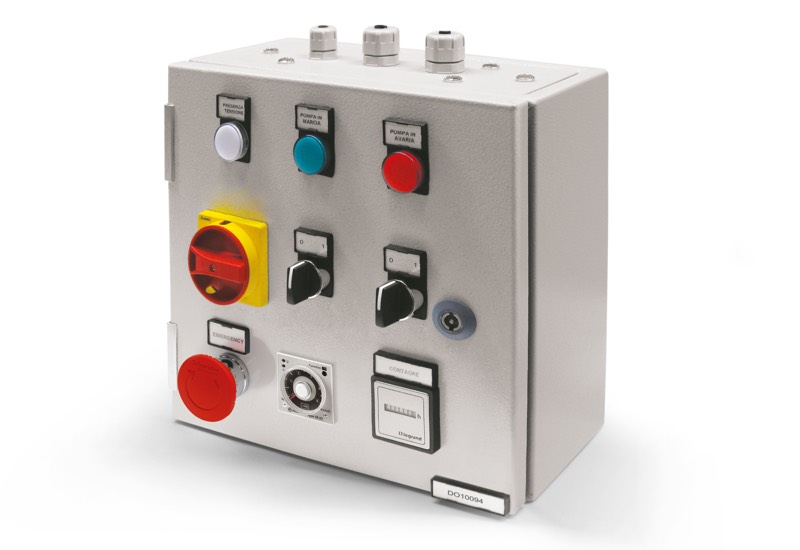 It is equipped with two remote control switches with thermal protection, fuses, a transformer for low voltage auxiliary command power supply, a line switch, a changeover switches for the automatic or manual pump operation, two digital vacuum switches, two hour-counters for measuring the actual pump operation time, an alarm siren with acoustic and lit signalling, a key selector for any necessary exclusion of the siren, test buttons and signalling lamps.